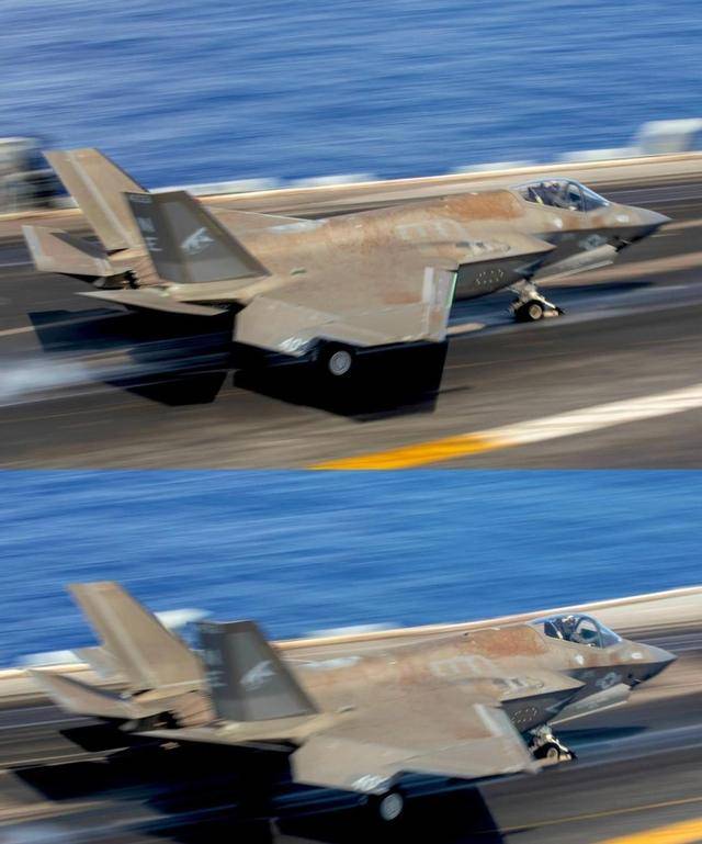 事故现场的照片显示,这架F-35C的机腹、机翼折叠处和舱门边缘覆盖着大片红褐色锈迹,部分区域的隐身涂层已经剥落,露出底下金属蒙皮的原色。